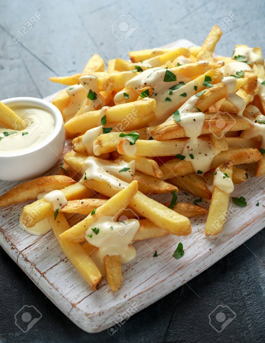 Homemade Potato French Fries With Cheese Sauce On White Wooden Board Stock Photo Picture And Royalty Free Image Image 117671127